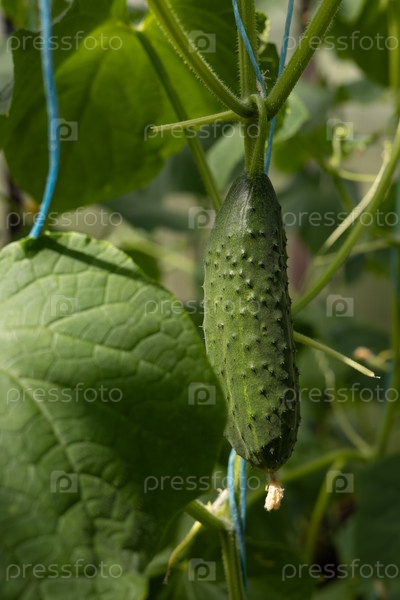 Зеленые огурцы и желтые цветы на стебле с пышными листьями растут в теплице