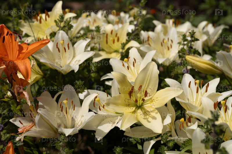 Лилия садовая белого цвета, подсвеченная солнцем в летний день