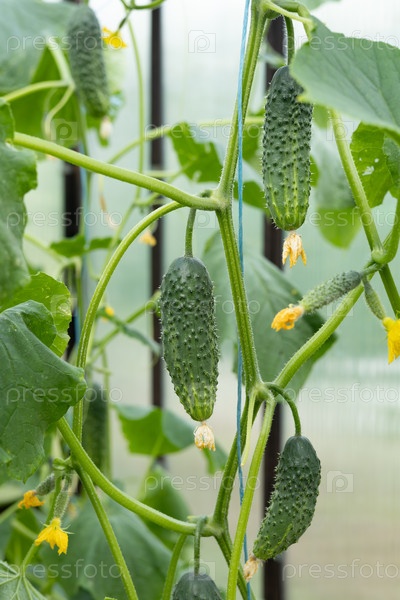 Зеленые огурцы и желтые цветы на стебле с пышными листьями растут в теплице