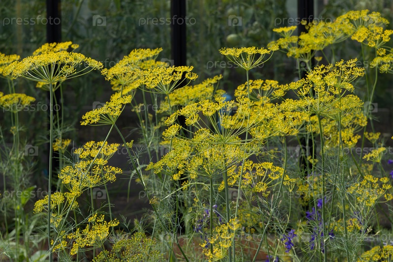 Семена укропа Anethum graveolens, собранные в зонтичные соцветия, полные семян растущих в саду