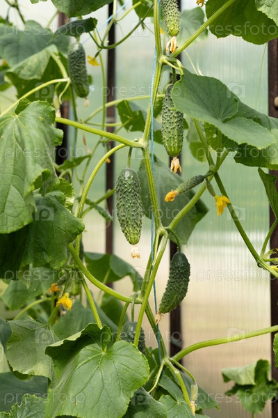 Зеленые огурцы и желтые цветы на стебле с пышными листьями растут в теплице