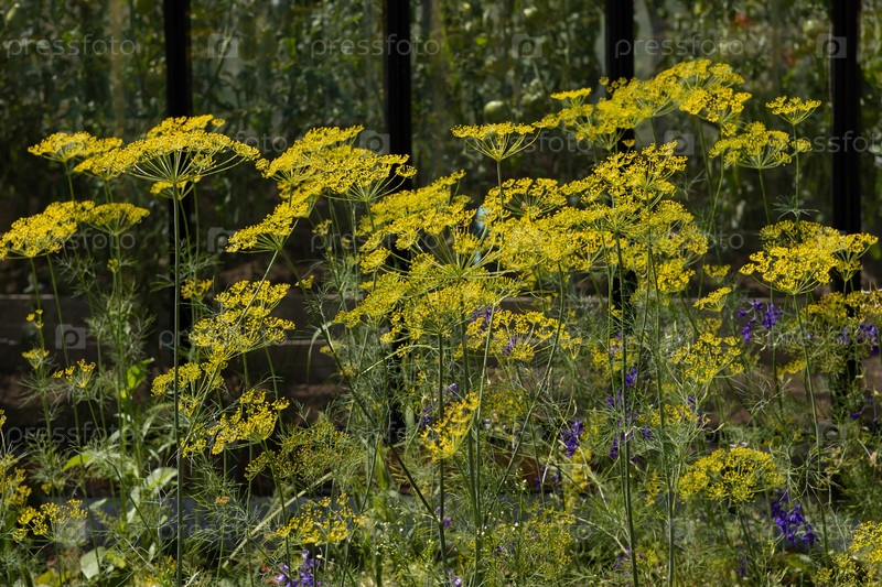Семена укропа Anethum graveolens, собранные в зонтичные соцветия, полные семян растущих в саду