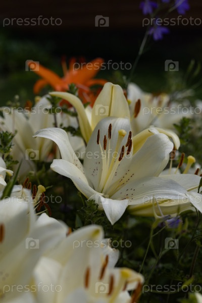 Лилия садовая белого цвета, подсвеченная солнцем в летний день