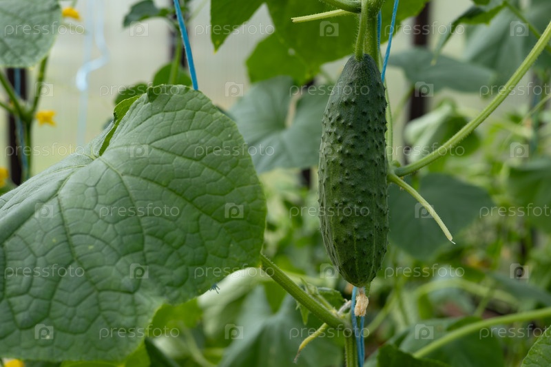 Зеленые огурцы и желтые цветы на стебле с пышными листьями растут в теплице