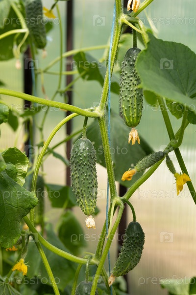 Зеленые огурцы и желтые цветы на стебле с пышными листьями растут в теплице
