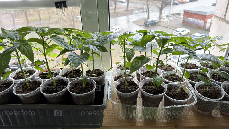 Рассада в горшке на подоконнике в доме, домашнее выращивание, весенняя подготовка к сезону