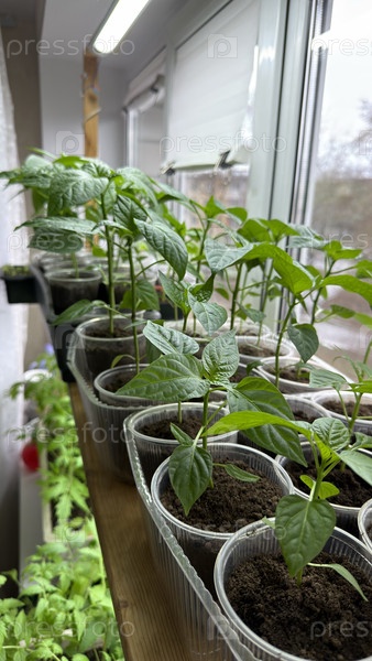 Рассада в горшке на подоконнике в доме, домашнее выращивание, весенняя подготовка к сезону
