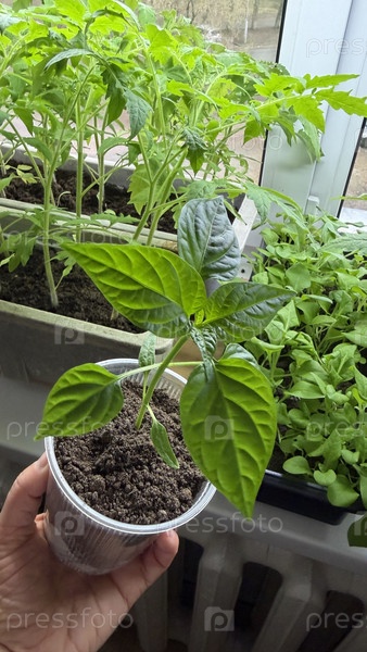 Рассада в горшке на подоконнике в доме, домашнее выращивание, весенняя подготовка к сезону