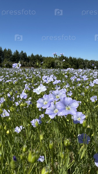 Лен цветущий в поле, голубые цветы, сельскохозяйственная масличная культура