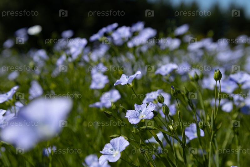 Лен цветущий в поле, голубые цветы, сельскохозяйственная масличная культура
