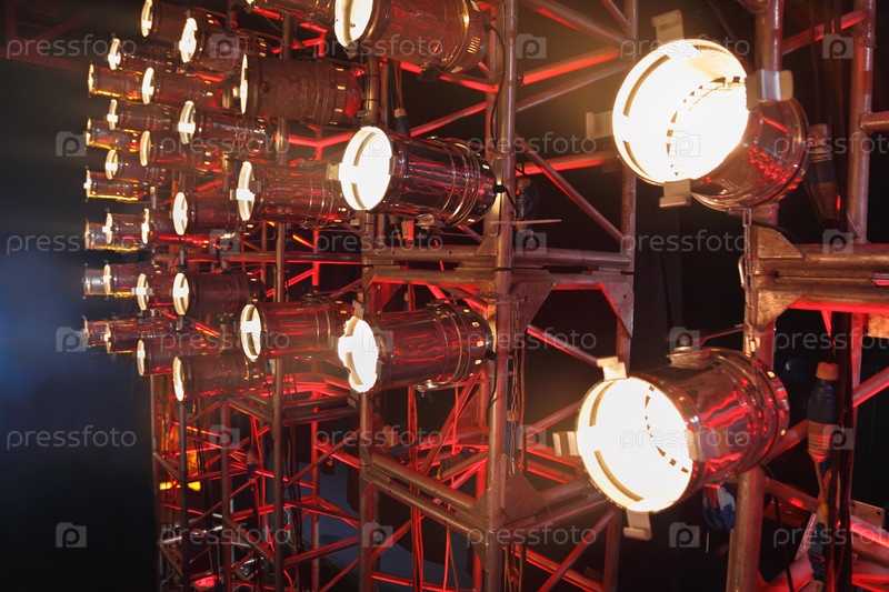 Ряд ярких прожекторов, установленных на металлических решетках, светит красным