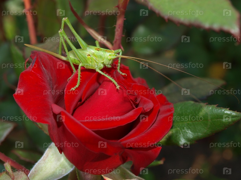 Кузнечик сидит на красной розе