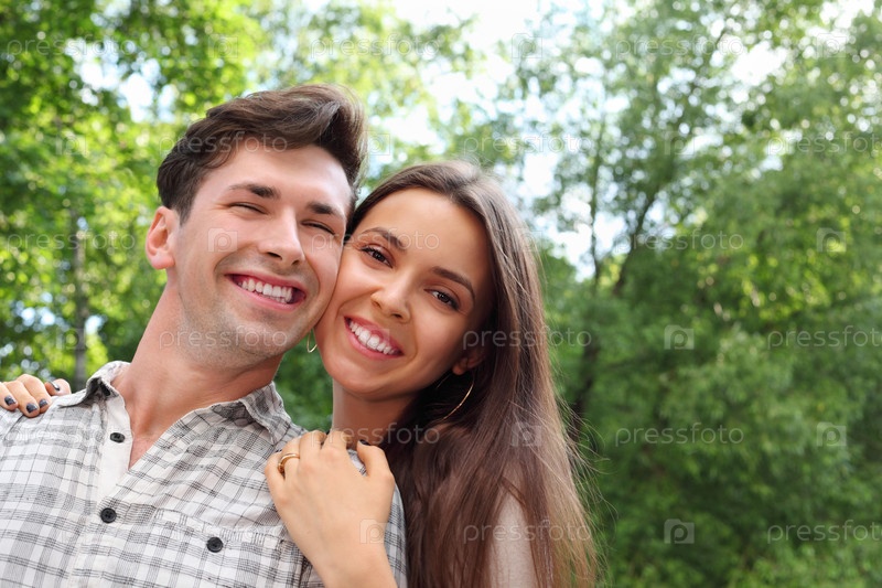 Счастливый мужчина и женщина стоят в парке; женщина держит на плечах человека;