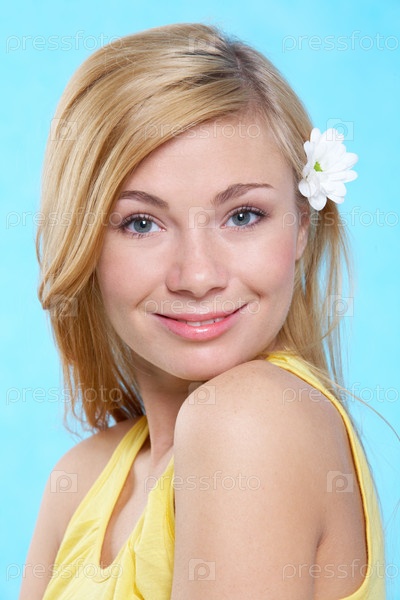 Портрет красивой блондинки с цветком в волосах