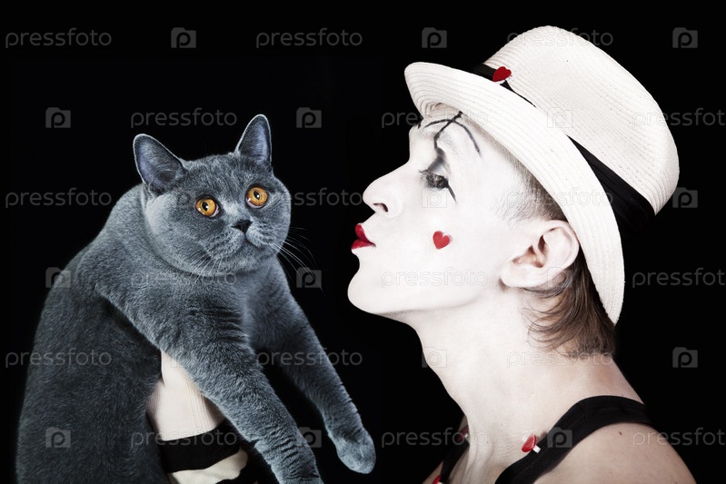 Мим в белой шляпе с серой породистой кошкой на черном фоне