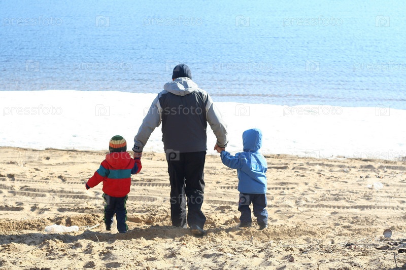 Папа с детьми гуляет по пляжу