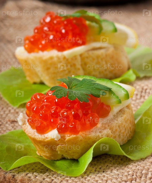 Бутерброд с красной икрой, сливочным маслом и огурцом
