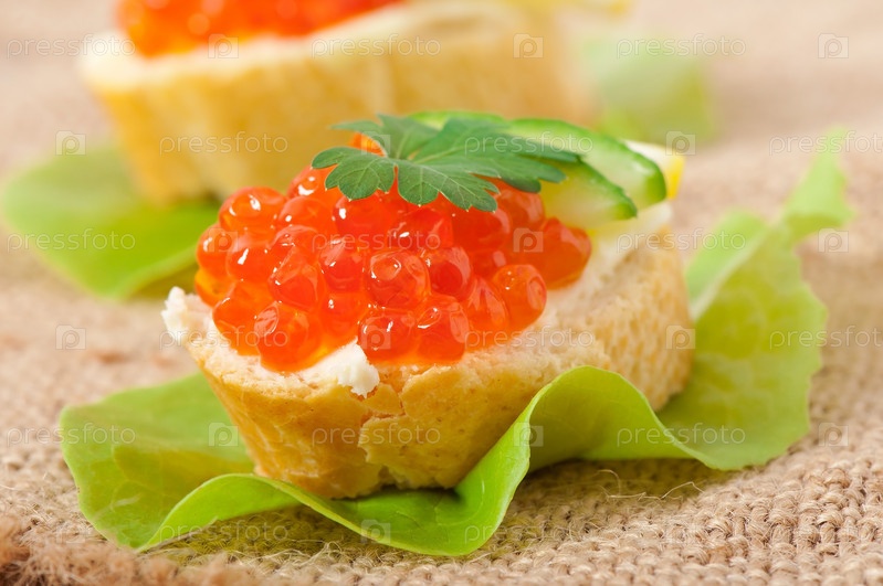 Бутерброд с красной икрой, сливочным маслом и огурцом