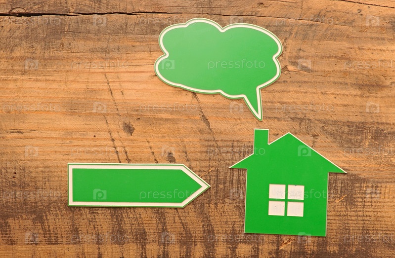 Пузырь для текста, дом и стрелка на деревянном фоне