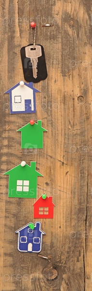 Серебряный ключ с пустой биркой и красочные модели домов на деревянном фоне