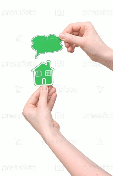 Модель дома и шаблон для текста в руках