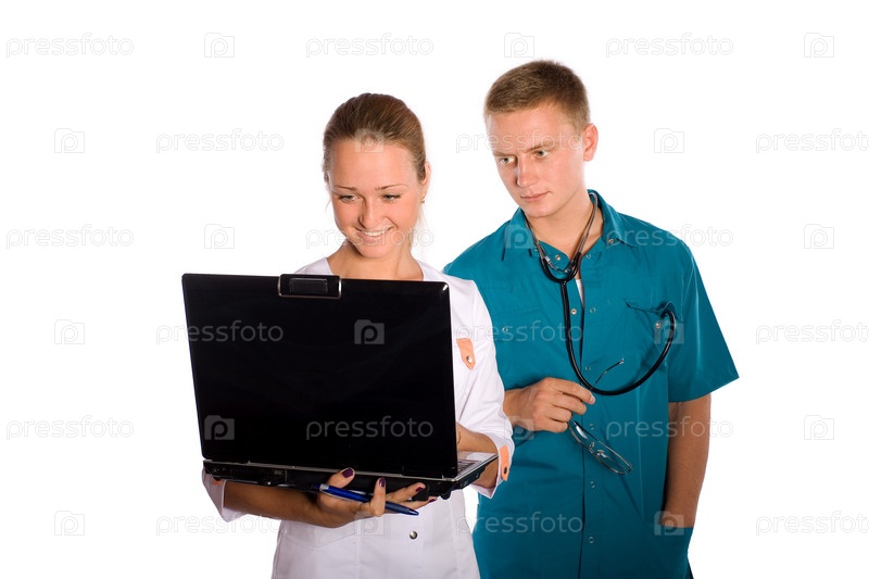 Медсестра и врач смотрят на экран ноутбука, изолированные на белом фоне