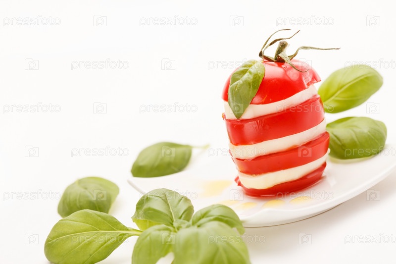 Ломтики помидора и сыра моцарелла, украшенные листьями базилика
