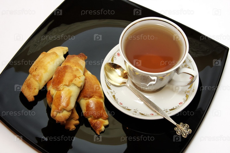 Кружка чая и выпечка на подносе