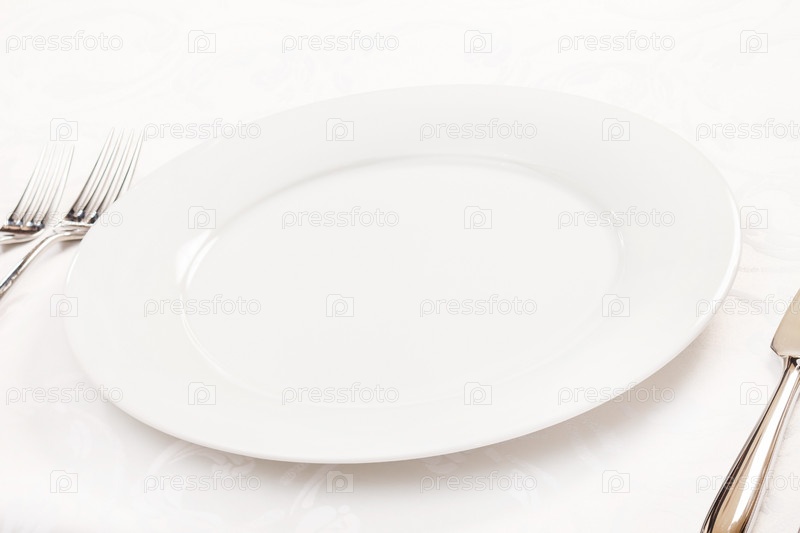 Белая пустая тарелка, вилка и нож