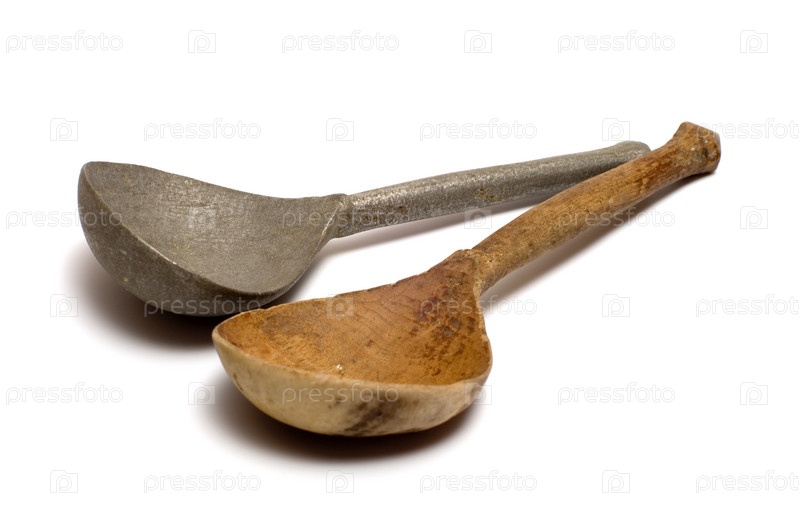 Деревянная и оловянная старинные ложки на белом фоне