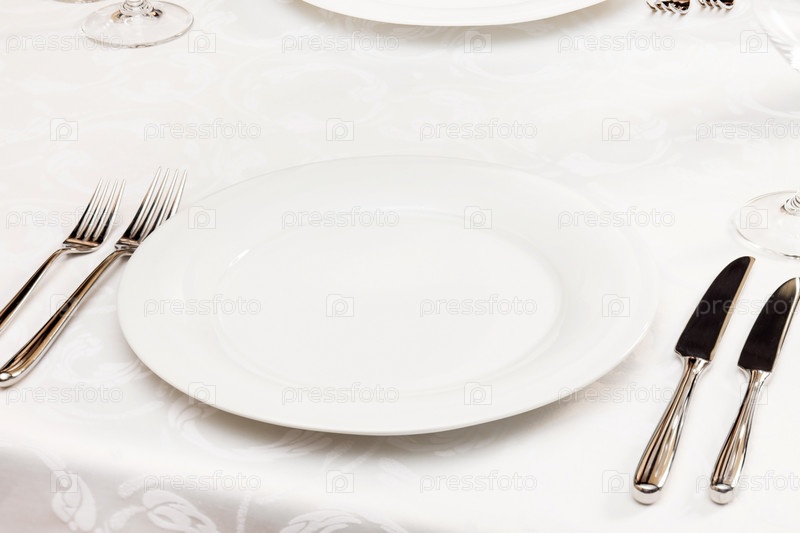 Белая пустая тарелка, вилка и нож