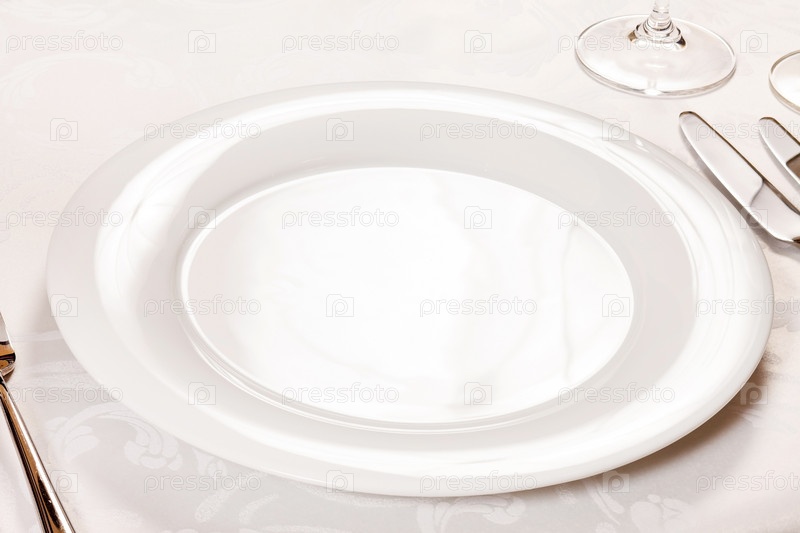 Белая пустая тарелка с вилкой и ножом