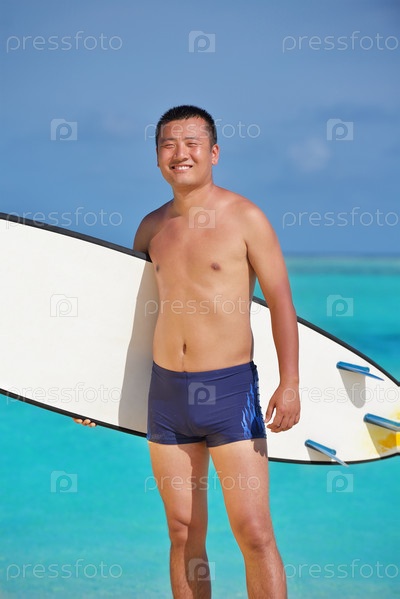 Мужчина с доской для серфинга на пляже