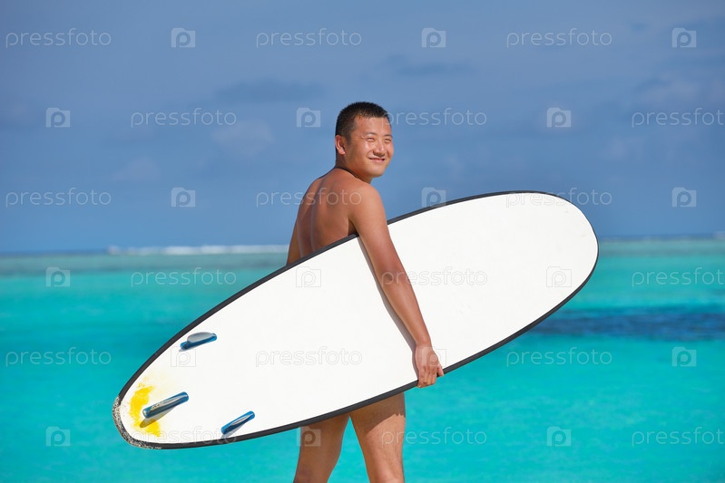 Мужчина с доской для серфинга на пляже