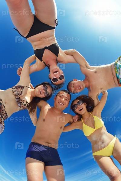 Группа счастливых молодых людей веселится на пляже