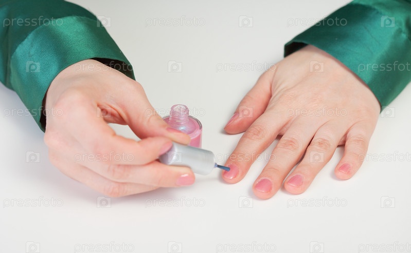 Женщина красит ногти розовым лаком