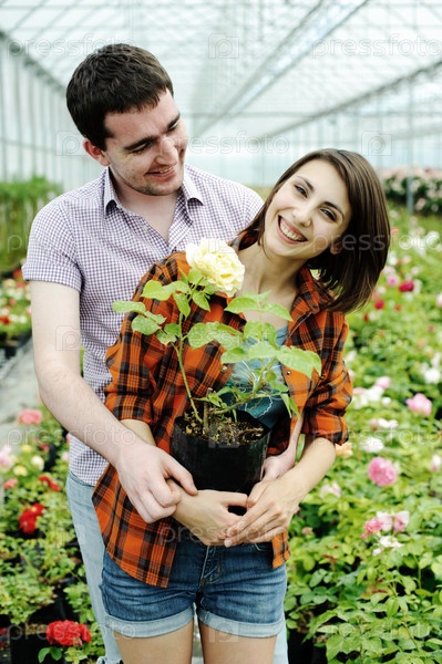 Молодая пара с цветочным горшком