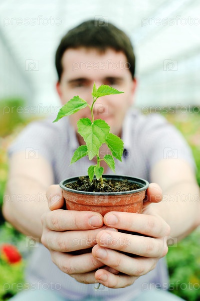Мужчина с растением в горшке