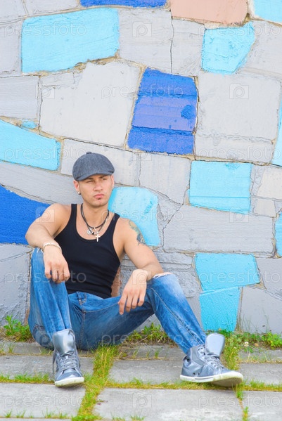 Молодой человек с татуировкой, сидит на тротуаре