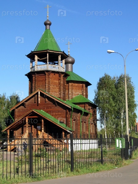 Деревянная русская церковь на фоне голубого неба