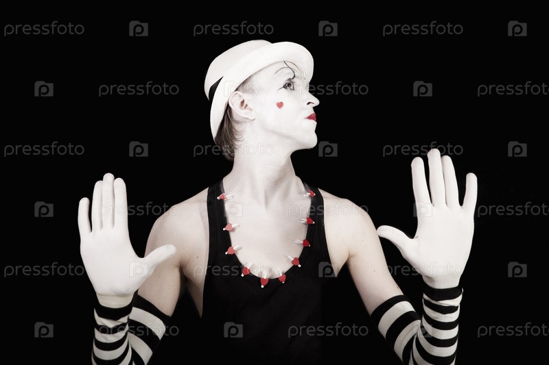 Пантомимщик в полосатых перчатках и белой шляпе на черном фоне