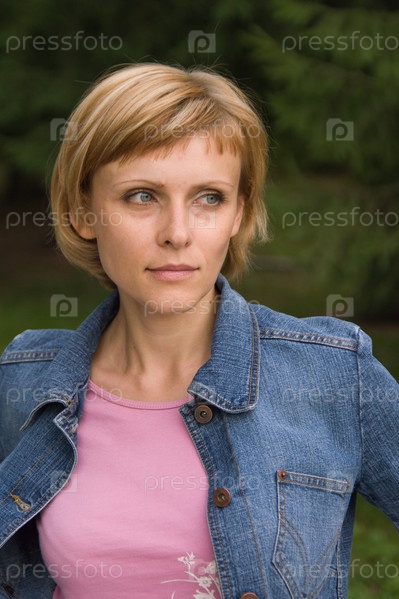 Молодая девушка в джинсовой куртке на фоне природы