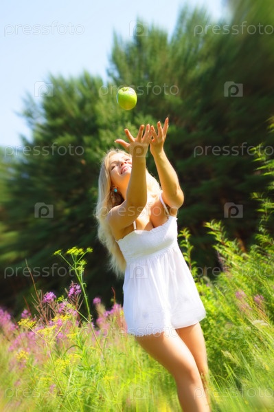 Красивая девушка ловит яблоко
