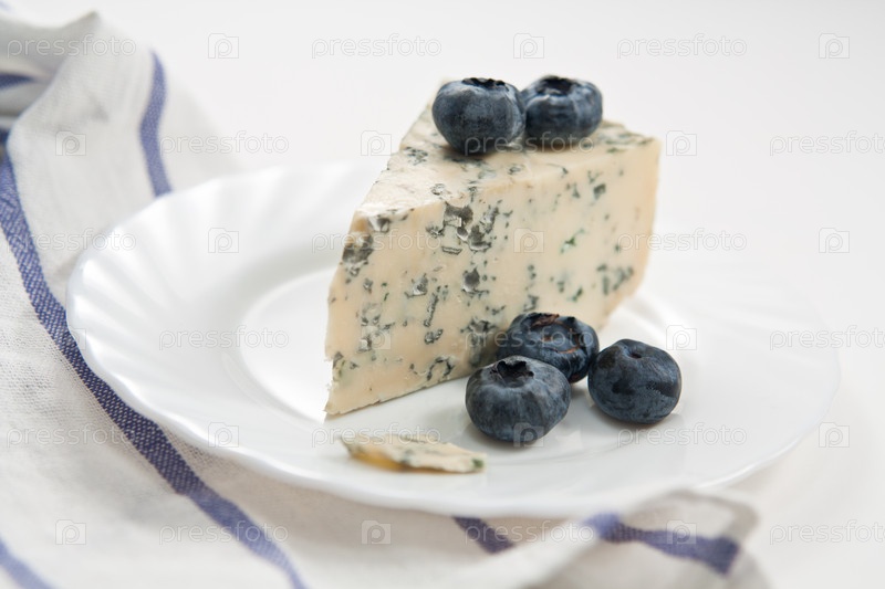 Сыр с плесенью и ягодами голубики на белой тарелке