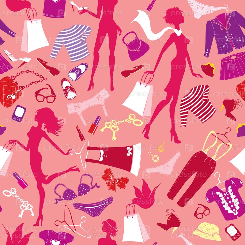 Бесшовный розовый шаблон с силуэтами модных девушек, яркой модно одежды и аксессуаров