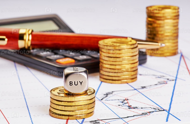 Кость со словом КУПИТЬ, стопки монет, калькулятор и ручка на финансовых графиках роста