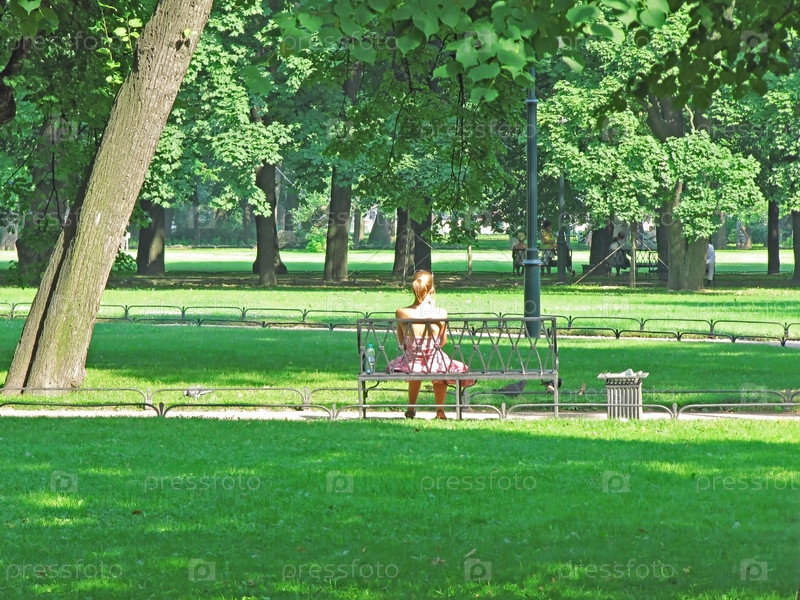 Молодая девушка сидит на скамейке в летнем парке