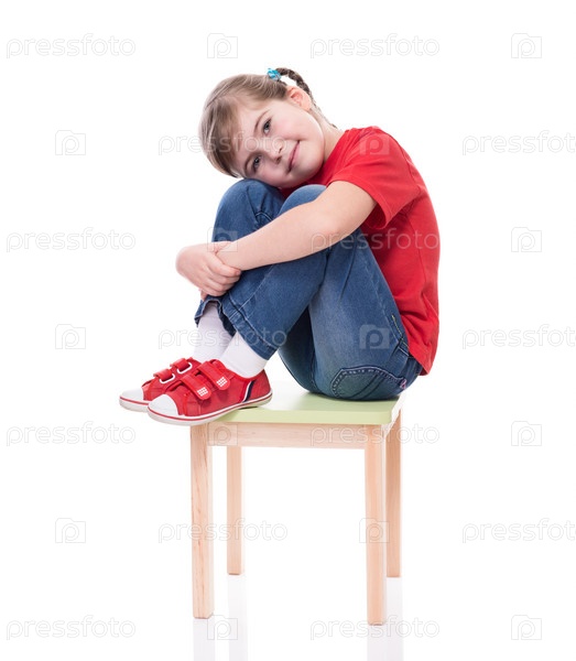 Девочка в красной футболке позирует на стуле