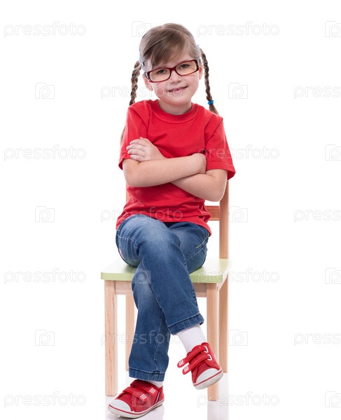 Девочка в красной футболке и очках позирует на стуле
