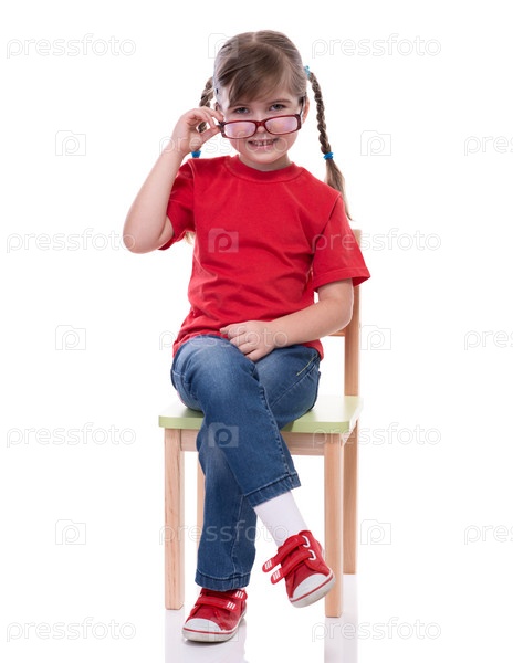 Девочка в красной футболке и очках позирует на стуле
